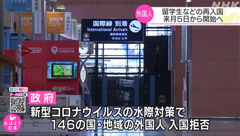 受新冠疫情影響,日本政府至今共禁止146個國家和地區的外國人進入日本。(NHK電視臺視頻截圖)