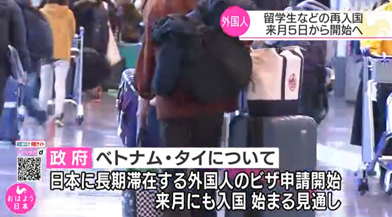 日本與越南、泰國將相互允許商務人員入境。(NHK電視臺視頻截圖)
