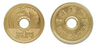 5日元硬幣上印的是稻穗、水和齒輪,這分別代表著農業、水產業和工業。而背面則是雙葉造型。