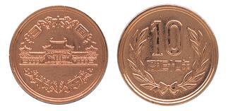 10日元硬幣正面印的是平等院鳳凰堂和唐草,印有數字10的一面的圖案是常綠闊葉樹枝,也寓意著永恒的活力。
