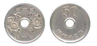 50日元是另一個有孔的硬幣,它的設計圖案與1日元一樣,同樣是公開募集而來的,名為《菊》。50日元上印的雖然是菊花,但其實這個圖案在這里并沒有什么特別的含義。