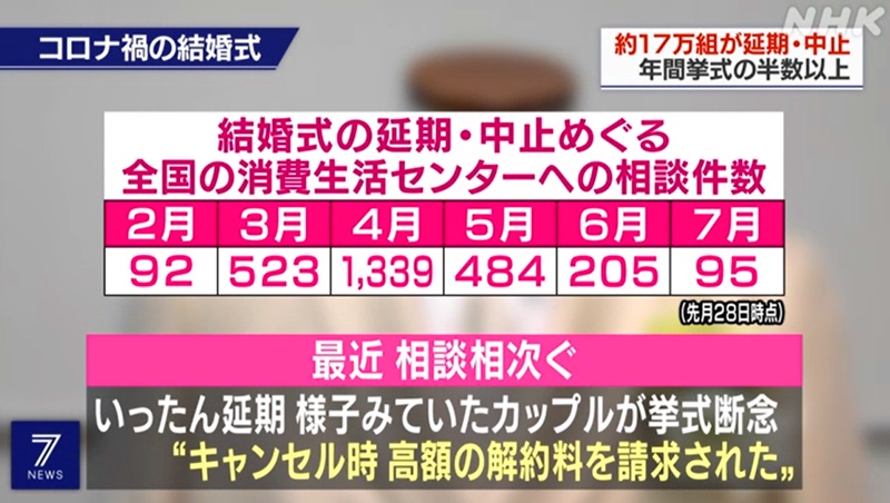 據日本婚禮文華振興協會調查并推算得知,自今年3月以來至9月末約有17萬對新人延期或取消婚禮。(NHK電視臺視頻截圖)