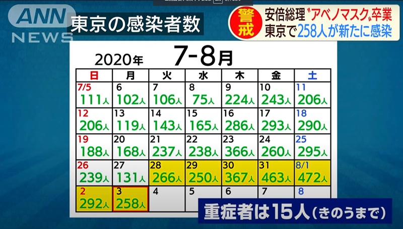 7月至8月初,東京的確診人數統計。(日本《朝日電視臺》視頻截圖)