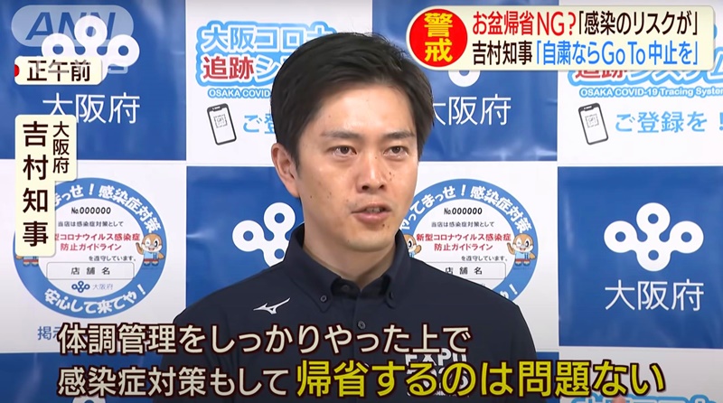 大阪府知事吉村洋文表示,如身體狀況和防疫措施都沒有問題,在盂蘭盆假期可以返鄉。(日本《朝日電視臺》視頻截圖)
