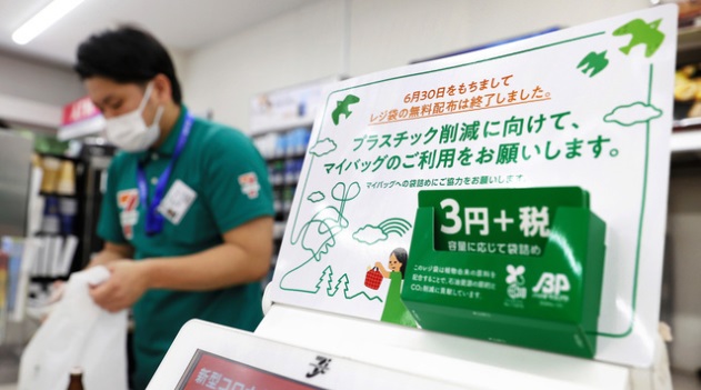 塑料袋收費的提示板。(圖片來源:日本《朝日新聞》網站)