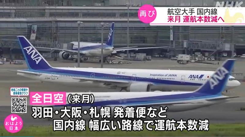 全日空在9月將大幅減少東京(羽田機場)、大阪以及札幌等地起降航班班次。(NHK電視臺視頻截圖)