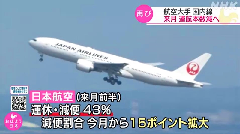根據日航公布的國內航線安排計劃顯示,9月上旬將有43%的國內線航班減航或停運,較8月(減航比例占整體28%)增加了15%。