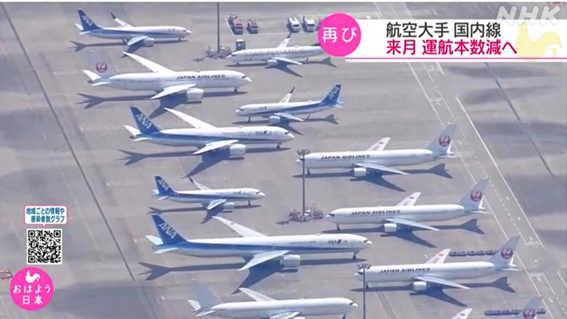 因疫情持續擴大以及國內航線上座率低,全日空及日航兩家航空公司決定進一步減航。(NHK電視臺視頻截圖)