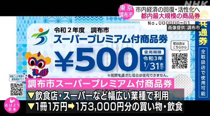 為恢復經濟,調布市目標將與市內約1000家商家及設施進行合作。(NHK電視臺視頻截圖)