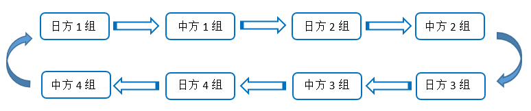此次活動由參加2019年在東京舉行的“中日大學生500人交流大會”的兩國大學生代表各12人參與。中日雙方大學生各分為4組,每組3人;首先由日方第一組學生提出3個問題,中方第一組學生每人分別作答,并向日方第二組學生提出3個問題,依此接力問答,最終由中方第四組學生向日方第一組學生提問。如下圖: