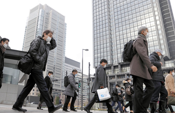 12日早晨走在街上的上班族。(圖片來源:日本《朝日新聞》網站)