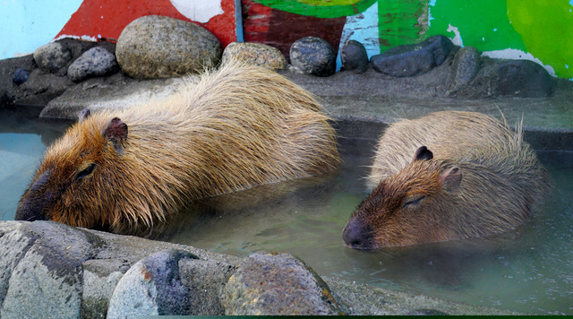 日本山梨縣一公園雌雄水豚泡溫泉 憨態可掬【2】
