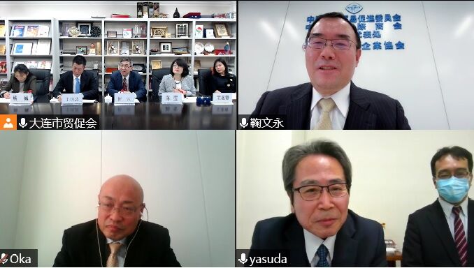 1月22日,“大連對日合作交流”線上會議召開(上左為大連市貿促會、上右為中國貿促會駐日本代表處總代表鞠文永、下左為日中投資促進機構事務局長岡豐樹、下右為日本國際貿易促進協會專務理事安田真人。圖片由大連市貿促會提供)