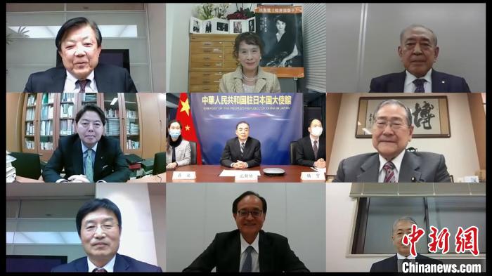 孔鉉佑大使(中)與日中友好團體負責人視頻交流。中國駐日使館供圖
