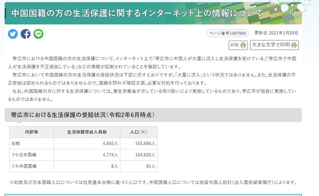 根據日本帶廣市政府在官網公開的數據顯示,截止至2020年6月該市共有4805人領取生活保障金,其中中國籍的有8人。居住在該市的中國人現有91人,與2015年6月統計時的118人相比還有所減少,不存在大批中國人移居當地和非法領取生活保障金的情況。