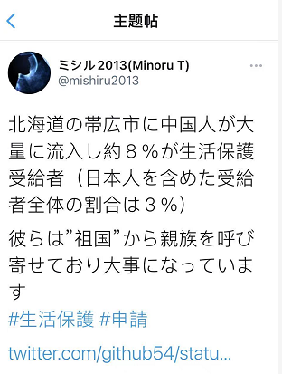 日本社交媒體上流傳的“大批中國人移居帶廣市,非法領取生活保障金”帖子(圖片為社交媒體截圖)
