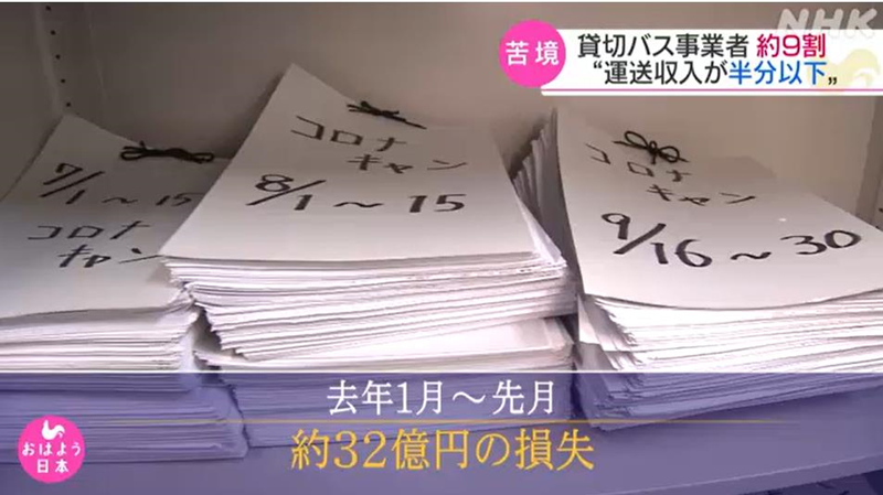 東都觀光巴士公司在2020年1月至2021年1月期間,因包車訂單被取消已造成大約32億日元(約合人民幣1.9億元)的損失。(NHK電視臺視頻截圖)