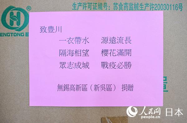 2020年年初,中國暴發新冠肺炎疫情,急缺物資。日本愛知縣豐川市第一時間抽調庫存防疫物資,向無錫市新吳區捐贈了4500只口罩及防護服,令人感動。后來日本暴發疫情,獲悉豐川市庫存抗疫物資短缺,無錫市新吳區想方設法籌措了5萬只口罩回贈給豐川市,并在包裝箱上寄語:“一衣帶水,源遠流長,隔海相望,櫻花滿開,眾志成城,戰疫必勝!