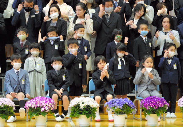 僅在拍照的短時間內默默無聲摘下口罩的1年級新生和家長們。(圖片來源:《朝日新聞》)