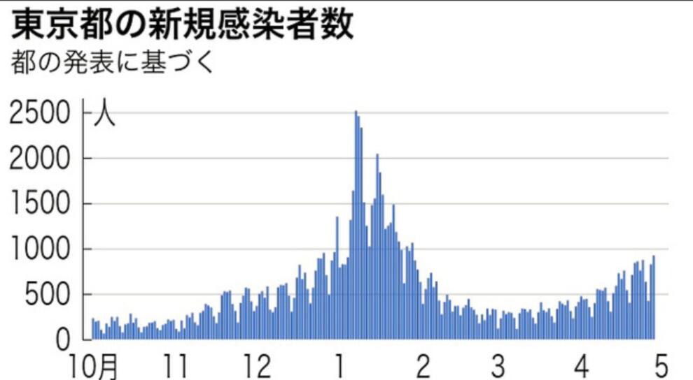 東京都最近半年間的新增確診病例數變化趨勢圖。(圖片來源:《朝日新聞》)