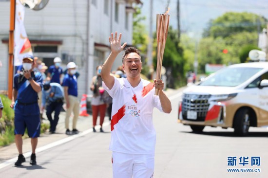 5月6日,在日本熊本縣阿蘇市,日本前奧運跆拳道選手樋口清輝在火炬傳遞中。新華社發(東京奧組委供圖)