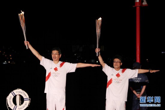 5月7日,火炬手小林充佳(左)在登上“遣唐使船”傳遞奧運圣火前,與前一棒火炬手山田潤交接圣火。新華社記者 杜瀟逸 攝