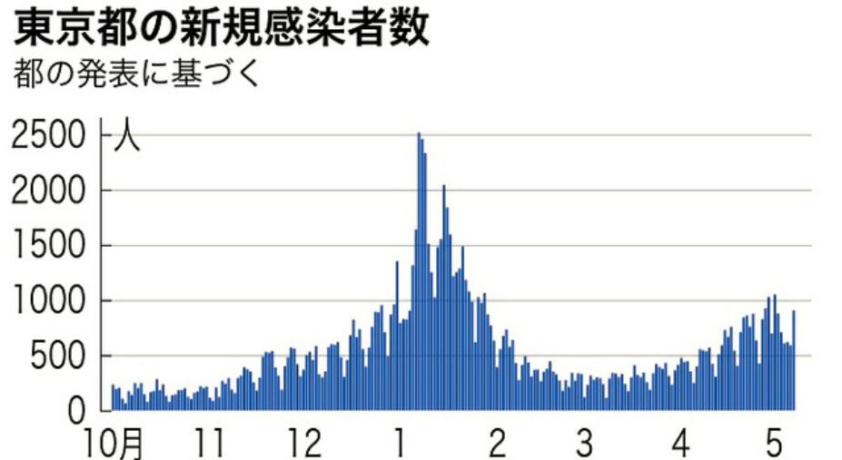 東京都最近半年間的新增確診病例數變化趨勢圖。(圖片來源:《朝日新聞》)