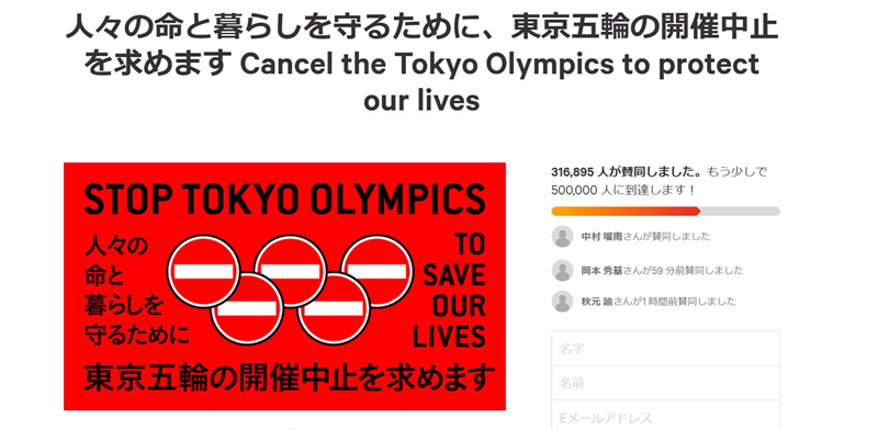 簽名網站Change.org上已有超過31萬人投票贊成“取消舉辦東京奧運會”。(圖片來源:Change.org官方網站截圖)