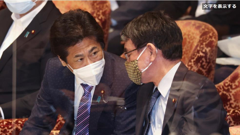 日本行政改革擔當大臣兼疫苗接種負責人河野太郎(右)與厚生勞動大臣田村憲久在會上進行交談。(圖片來源:《朝日新聞》網站)