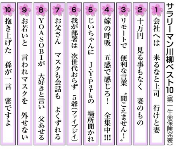 本屆“上班族川柳大賽”最佳作品來自一位30多歲男性,他寫道“會社へは 來るなと上司 行けと妻(領導說 別來公司了 妻子說快滾)”。疫情下領導要求在家辦公,而妻子早已對他“相看生厭”……夾在領導和妻子中間的上班族生存慘狀躍然紙上。