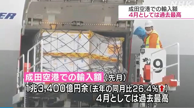 日本成田機場4月進口額同比增長26.4%。(NHK電視臺視頻截圖)