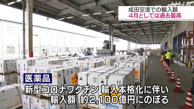 日本成田機場4月“醫藥品”進口額約占總進口額的16%。(NHK電視臺視頻截圖)