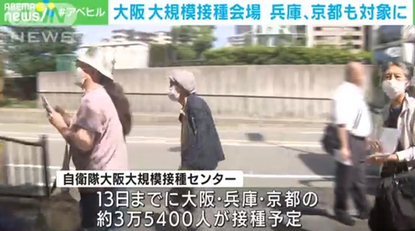 在6月13日前,位于大阪的大型新冠疫苗接種中心將為大阪、兵庫、京都的約3萬5400人進行疫苗接種。(朝日電視臺視頻截圖)
