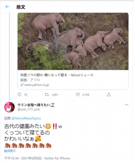 日本雅虎新聞在推特上報道云南北遷象群后,日本網友留言。