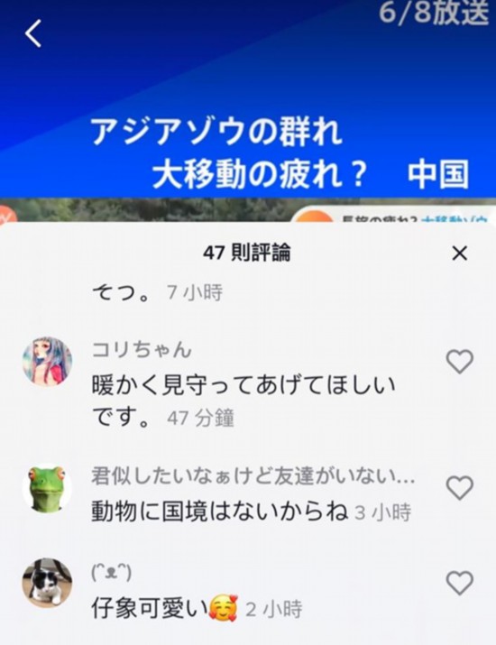 日本TBS電視臺、日本朝日電視臺在TIKTOK上發布了大象遷移短視頻后,日本網友在評論區中寫下:“小象好可愛”“大象是想去看海吧”“請中國溫暖守護好大象”等留言。