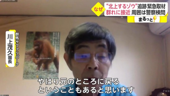群馬狩獵公園園長川上茂久圍繞象群遷移接受富士電視臺采訪。富士電視臺視頻截圖