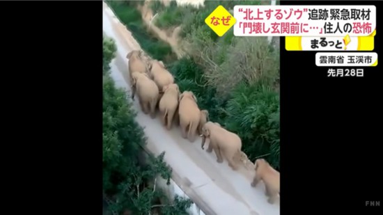 朝日電視臺、富士電視臺駐中國的記者趕往云南并對沿途的中國民眾進行了采訪。通過日媒的系列報道,日本民眾了解到了北遷象群的最新動向、當地為確保沿途群眾安全所采取的區域性防護辦法、使用無人機對象群進行實時監測保護等一系列應對措施!跋蟆蓖畏?圍繞象群的最終目的地這一話題,富士電視臺連線了群馬狩獵公園園長川上茂久,他猜測不排除存在象群最終會再度折返,回到最初棲息的自然保護區這一可能性。
