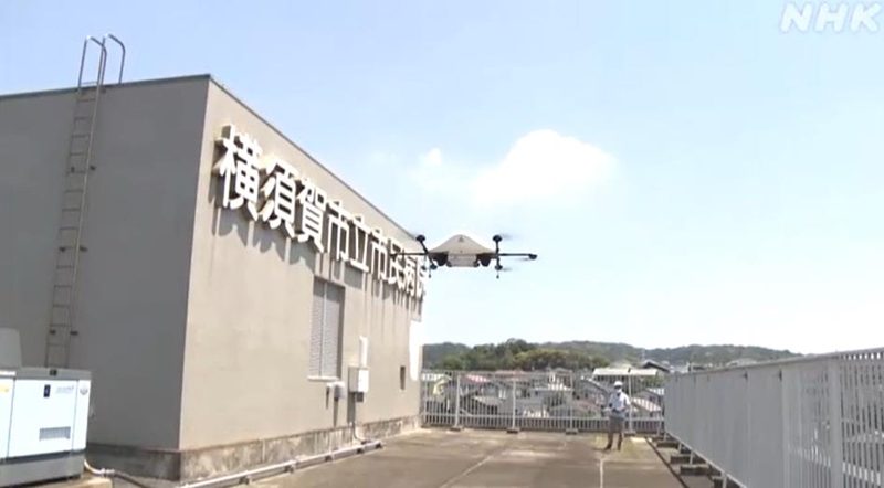 約15分鐘后,無人機將牛肉飯平穩送抵大約5公里外的橫須賀市立市民醫院天臺。(NHK電視臺視頻截圖)