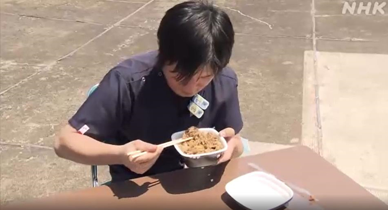 橫須賀市立市民醫院的護師品嘗無人機送達的牛肉飯。(NHK電視臺視頻截圖)