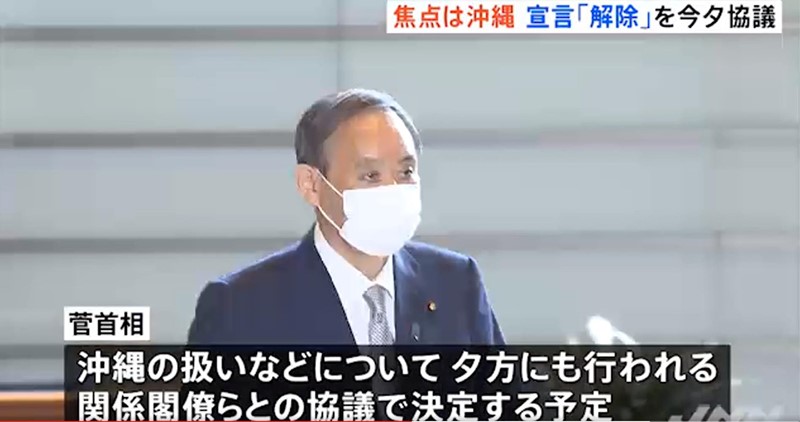 日本首相菅義偉16日晚與相關內閣成員就是否解除緊急狀態進行協商。(日本TBS電視臺視頻截圖)