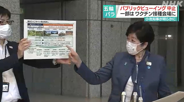 東京都知事小池百合子(右)對取消公眾觀賽活動的決定進行說明。(NHK電視臺視頻截圖)