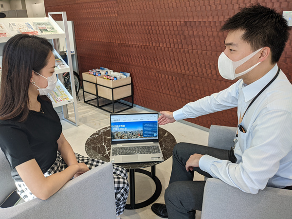 6月21日,建行東京分行員工向客戶介紹使用“全球撮合家”平臺“日本專區”。(孔慶賢 攝)