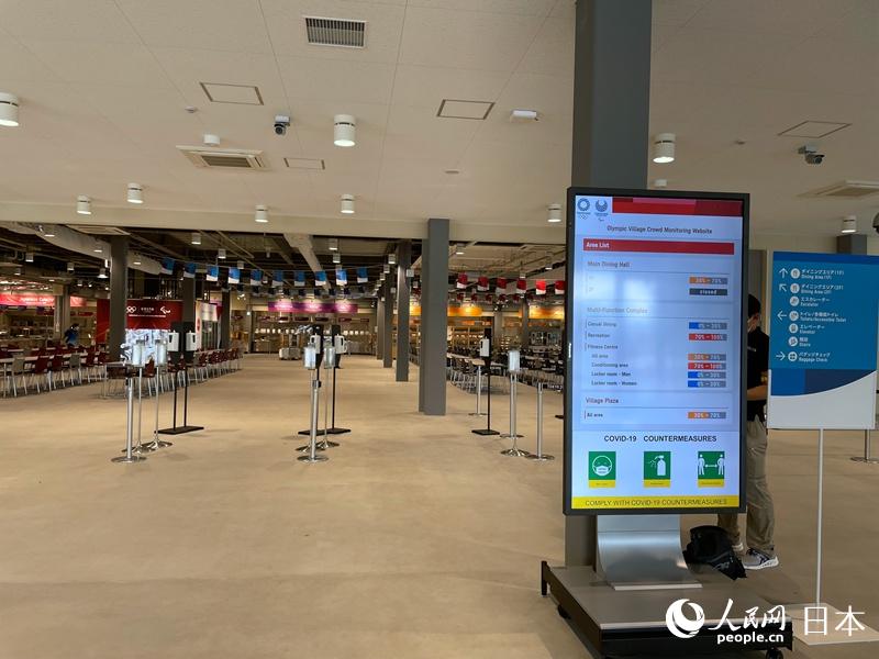東京奧運會奧運村主餐廳內設置的電子屏,可顯示設施內擁擠狀況。吳穎攝