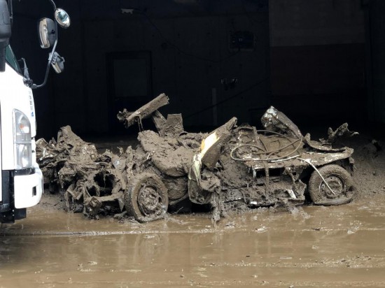 7月4日在日本靜岡縣熱海市拍攝的在泥石流災害中受損的汽車殘骸。新華社記者華義攝