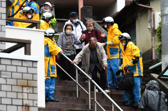 7月4日,救援人員在日本靜岡縣熱海市協助轉移當地居民。新華社記者華義攝
