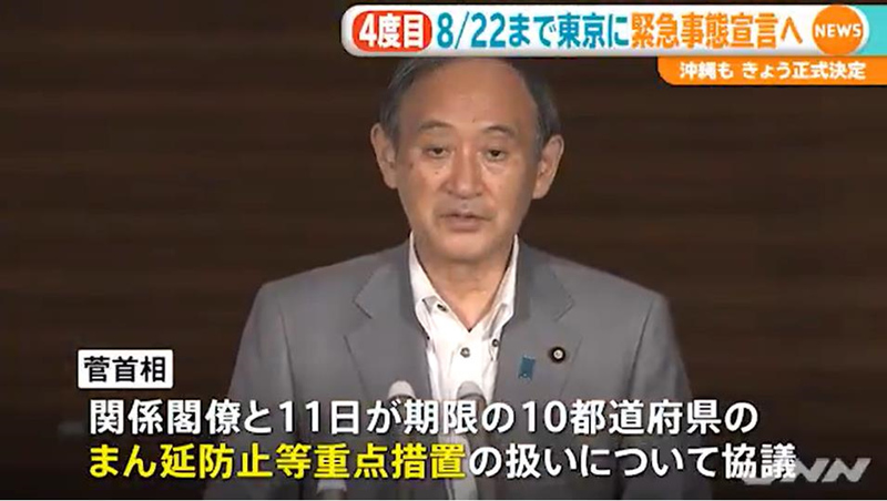 除了東京都,日本政府還計劃將沖繩縣的緊急狀態延長至8月22日,并將埼玉縣、千葉縣、神奈川縣和大阪府的“防止蔓延等重點措施”同步延長至8月22日。