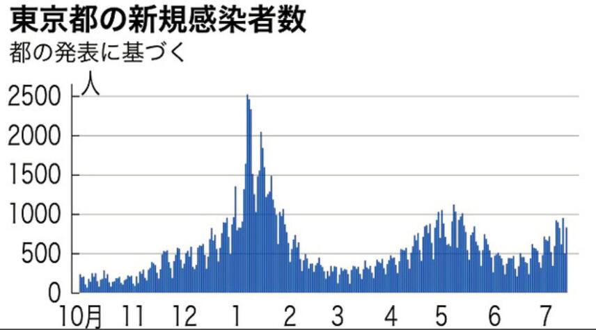 東京都最近半年間的新增確診病例數變化趨勢圖。(圖片來源:《朝日新聞》)