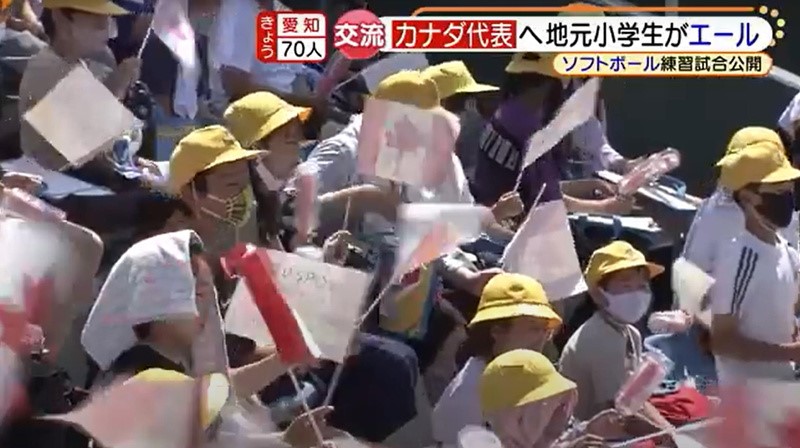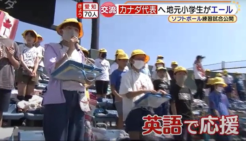 當地小學生用英語為加拿大壘球代表隊加油。(名古屋電視臺視頻截圖)