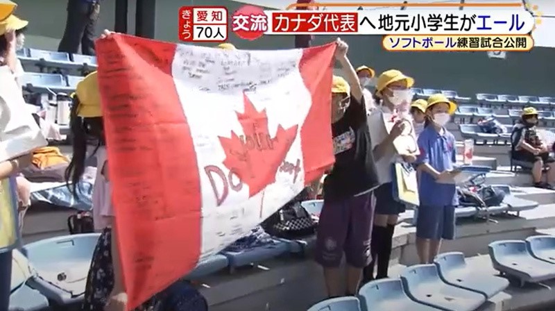 當地小學生手舉用英語寫滿祝福語的加拿大國旗為加拿大壘球代表隊加油。(名古屋電視臺視頻截圖)