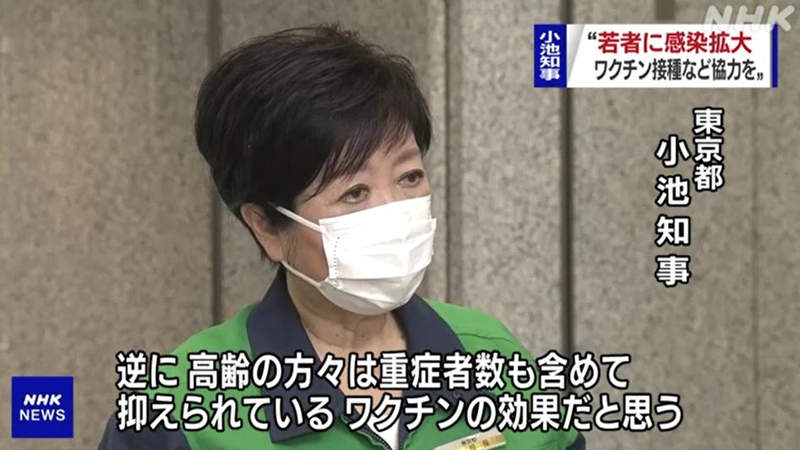 東京都知事小池百合子15日在東京都廳接受采訪時表示:“20歲至39歲年齡段的年輕群體確診病例數的增幅顯著。反觀老年群體的新增確診病例數及重癥病例數均得到控制,說明接種新冠疫苗有一定效果!毙〕胤Q,只有民眾自覺地采取防疫措施和接種疫苗,才能避免疫情規模超過“第四波疫情”。她呼吁民眾積極配合政府嚴格執行防疫措施。